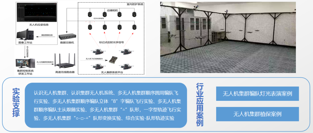 集群类平台是支持在室内光学定位、UWB定位、室外RTK定位等实现无人机之间的集群控制平台。本平台支持集群通信技术,在统一控制接口下实现无人机的按照规划路线运动,掌握多机编队和协同控制等的方法及行业应用。无人机集群类产品可支撑有一定实力的职业院校或职业本科进行深层次的人才培养。