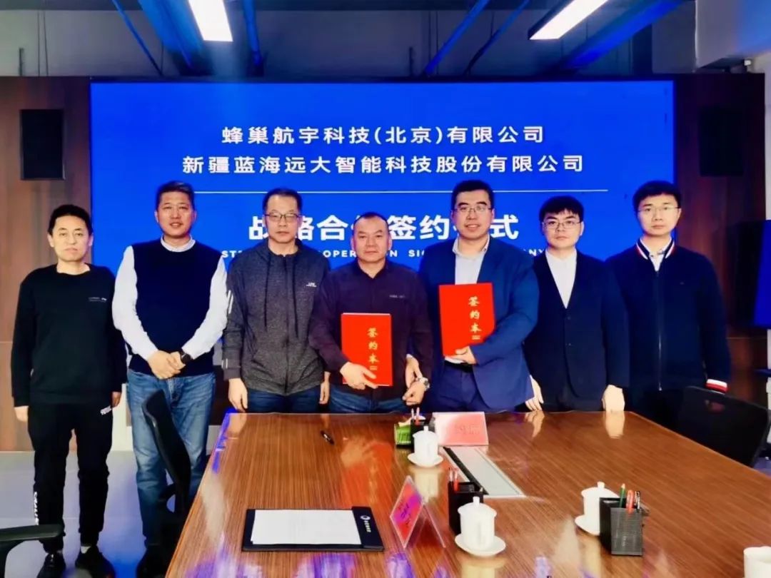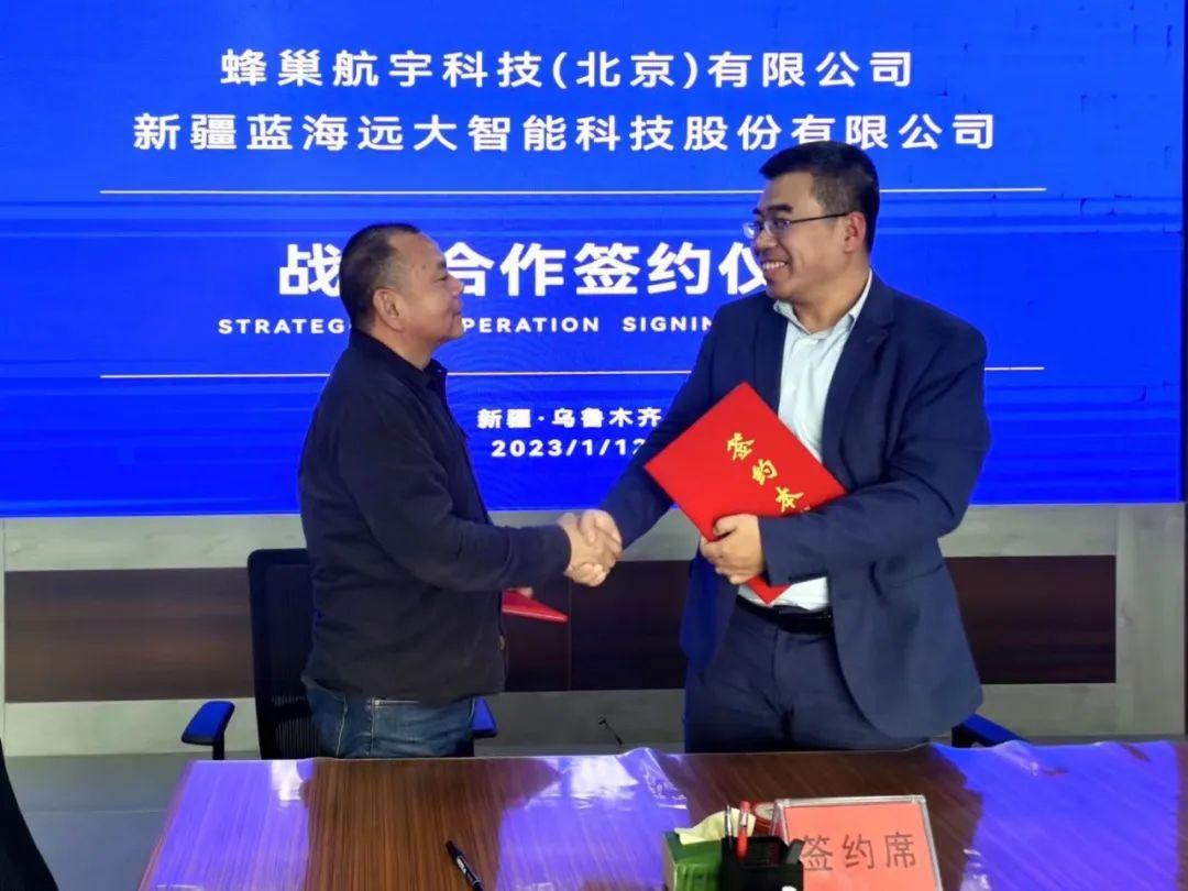 2023年1月12日,蜂巢航宇科技(北京)有限公司与新疆蓝海远大智能科技股份有限公司(以下简称“新疆蓝海远大”)进行座谈交流会议,并签署了战略合作协议。双方将依托各自优势资源,打造牢固的战略合作伙伴关系,实现技术对接与产品融合,整体合作共赢,共同发展,在国内市场融合集成,国际贸易等领域进行深度产业合作,共同开拓国内外无人机市场。