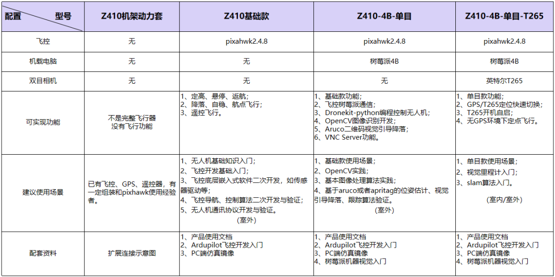 Z410是阿木实验室与苍穹四轴DIY结合科研入门学习的需要,专为无人机开发者打造的二次开发平台,适用于无人机及机器人专业的入门级科研开发和应用研究(Z410的Z代表Zero,即为初学者打造的一款从零开始学习的无人机/机器人开发学习产品)。我们希望通过它来引导大家从入门到了解并熟悉现在优秀的开源项目ArduPilot/DroneKit/ROS,以及优秀的开源硬件Pixhawk。在此基础上结合自己的研究项目,开发丰富的无人机应用。