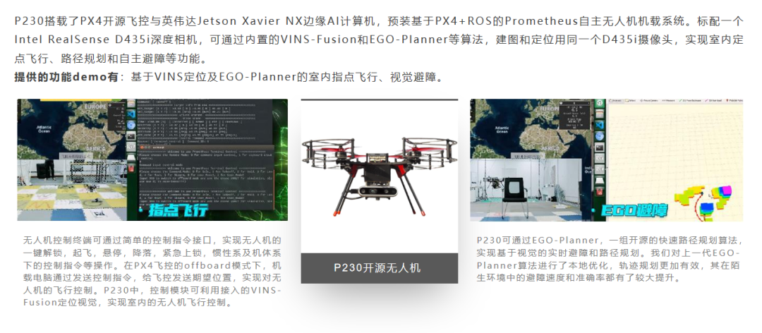 P230是阿木实验室专为科研工作者与航天器开发者打造的小型化无人机开发平台,采用类穿越机的设计,机身采用一体碳板结构,减轻重量的同时保留了机载电脑、视觉传感器和飞控的拓展空间。适用于无GPS环境下基于视觉的无人机定位/导航/避障算法的验证与开发,以及室内无人机组网编队的研究。