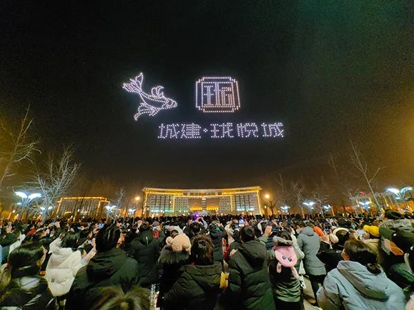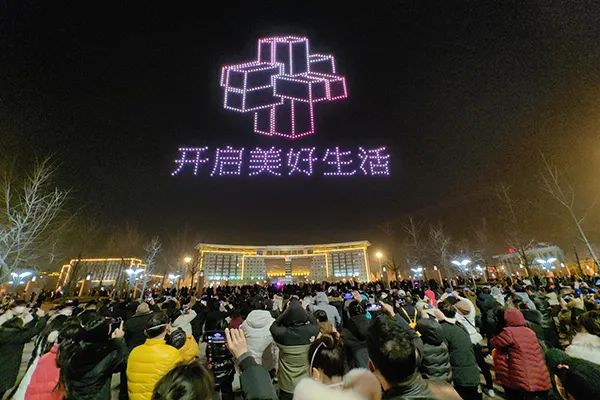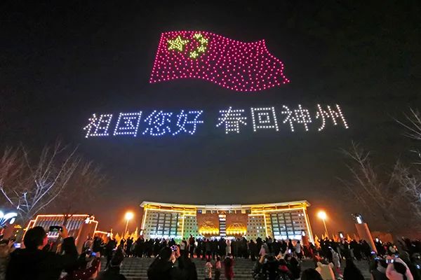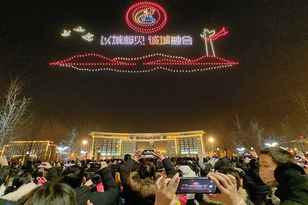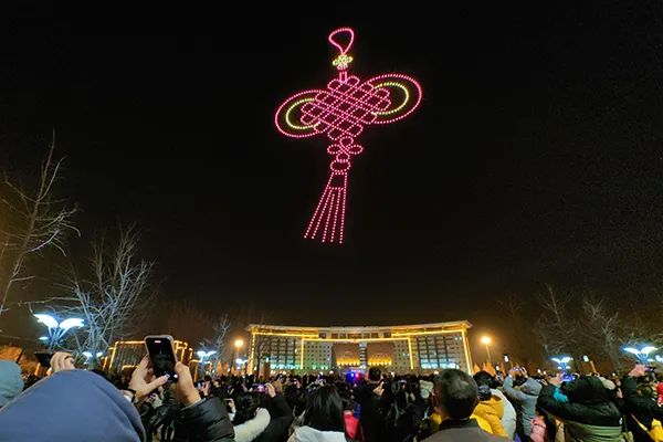 整场表演闪闪流光、瞬息万变,传统年味与新潮科技激情碰撞。现场人山人海,大家仰望着璀璨夜空,目不转睛地观赏起落交错的队形、精美大气的造型,惊叹声、欢呼声此起彼伏。