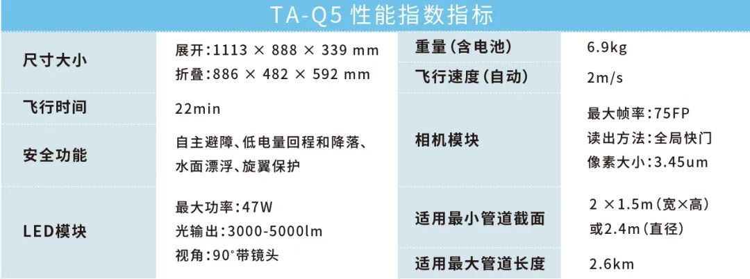 作为一款专为完成各类地下隧道巡查作业而设计的无人机,TA-Q5 具有尺寸小、可折叠、易携带等绝对性优势。