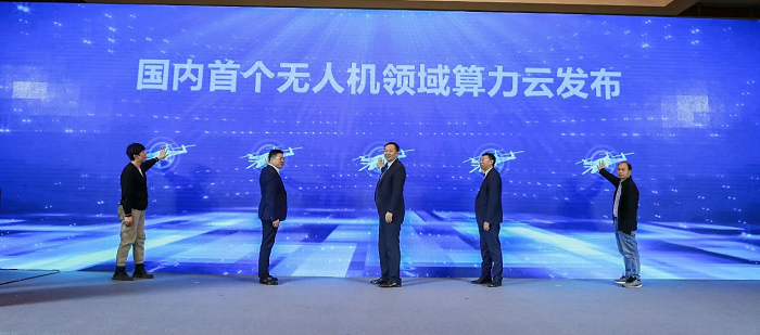 大会现场举行了国内首个无人机领域算力云发布仪式,国家(中卫)新型互联网交换中心总经理宋吉飞、西谷云董事长马锦洲、西谷云CEO田凤宾、航大汉来(天津)航空技术有限公司董事长乔雷章、深圳思洛普科技有限公司董事长刘远树共同上台发起启动仪式。