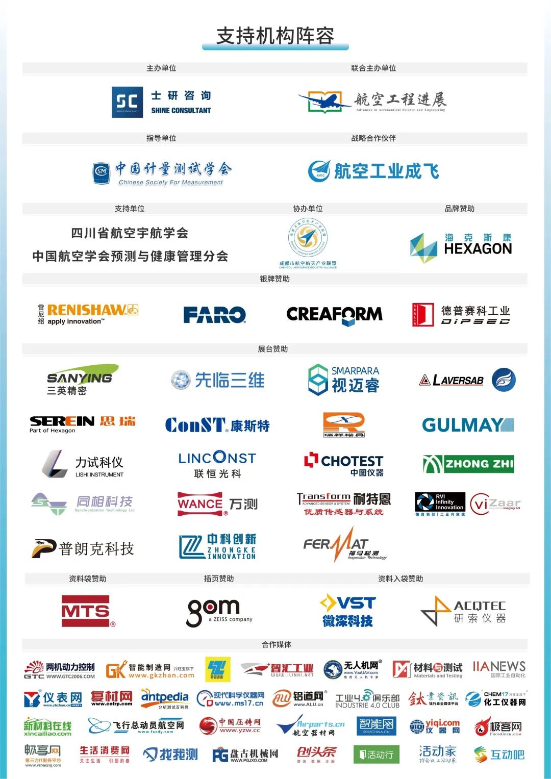 主办单位: 士研咨询成立于2005年,致力于为组织领导者提供沟通交流与专家智库平台。通过二十年沉淀与积累,覆盖了金融与投资、交通与运输、消费与文旅、医药与医疗、能源与资源、高科与电信、公用与政府等产业领域,服务着全球500强和万余家领导型企业,汇聚了百万余名机构决策者,并与千余家产业权威机构建立了战略伙伴关系。士研咨询秉承专业立身的理念发展队伍,现拥有百余名专业的资深人员,核心管理团队都具有十五年以上的专业经验。 联合主办单位: 《航空工程进展》是由中华人民共和国工业和信息化部主管,西北工业大学和中国航空学会联合主办的学术期刊,国内统一连续出版物号:CN 61-1479/V ,国际标准连续出版物号:ISSN 1674-8190,A4开本,双月刊,面向国内外公开发行。期刊集学术性、权威性、前瞻性与专业性于一体,具有较高学术价值,作者和读者遍布全国航空航天相关的科研机构、高等院校及企事业单位,是从事航空航天领域的专业人才学术交流的新型平台。 指导单位: 中国计量测试学会成立于1961年2月28日。学会是国家民政部批准登记注册的全国性、学术性、非盈利社会团体。上级行政主管部门为国家市场监督管理总局(以下简称国家市场监管总局)。接受国家市场监管总局和中国科学技术协会(以下简称中国科协)的业务领导,是中国科协的团体会员单位。代表中国参加国际测量技术联合会(IMEKO),担任该组织理事会理事。在IMEKO的25个专业技术委员会中有29名专家加入并承担主要职务。 战略合作伙伴: 航空工业成都飞机工业(集团)有限责任公司(简称航空工业成飞),创建于1958年,是我国航空武器装备研制生产和出口主要基地、民机零部件重要制造商,国家重点优势企业。航空工业成飞积极践行“航空报国,航空强国”理念,在军机方面,研制生产了歼5、歼7、枭龙、歼10 等系列飞机数千架,歼-10飞机荣获国家科技进步奖特等奖;国外军机用户达十多个国家。在民机方面,与成飞民机公司一道承担了大型客机C919、新支线客机ARJ21、大型水陆两栖飞机AG600机头的研制生产;是国际一流的民机大部件供应商,累计生产交付民机转包产品一万多架份。大力发展无人机产业。航空工业成飞荣获全国“五一”劳动奖状、全国文明单位、全国质量奖、全国企业文化建设示范基地、全国模范职工之家、中国企业自主创新奖等荣誉称号,是中国企业形象AAA级单位。 支持单位: 四川省航空宇航学会是由在川、渝两省市从事航空航天技术服务、教学和产品研制的企事业单位及相关单位为依托的跨部门的非盈利法人社会团体,是航空航天科学技术工作者自愿结成登记成立经省科协接纳的学术性组织。 中国航空学会预测与健康管理分会是挂靠于中国飞机强度研究所下的,主任委员是李应红院士,联合团队为中国飞机强度研究所(623),空军工程大学(空工大),沈阳飞机设计研究所(601),中国商用航空发动机有限公司(商发),中国航空无线电电子研究所(615),西安交通大学(西交大),西北工业大学(西工大)。 协办单位: 成都市航空航天产业联盟成立于2020年6月,是按照成都市委市政府推动航空航天产业发展要求,由我市航空航天领域具有代表性和影响力的研究、开发、制造、运营、服务的企事业单位和有关机构共同发起、自愿组成的非营利性社会组织。 联盟接受市口岸物流办和市经信局的业务指导,是全市产业生态圈中,首个实体化注册运营的联盟。主要职能有:1、宣传国家、省、市有关航空航天的方针政策、法律法规,协助主管部门制定行业标准、政策办法、产业规划等;2、组织航空航天产业市场开拓,促进项目对接、业务合作,宣传发布行业信息,编辑出版相关资料、报告、期刊;3、组织开展对外交流活动,指导和举办与会员企业相关的会议、展览、培训、评价表彰等活动;4、向会员开展行业指导、技术咨询、行业调查、评估论证、人才培训、技术交流、专家顾问等服务;5、筹备、组建成都市航空航天产业研究院及成立产业专家委员会;6、组织参与课题研究、项目申报、产业投资等(不得从事非法集资、吸收公众资金等金融活动)。 联盟作为促进航空航天产业链、创新链、价值链、供应链上下游和左右岸资源要素整合提升的重要抓手,充分发挥政企桥梁纽带作用,推动“政产学研用融”一体化融合发展。为提升产业凝聚力和竞争力,推动航空航天产业建圈强链发展,联盟始终坚持整合资源、开放共享,积极与省市区有关部门和国家级行业组织保持密切联系与往来,积极促进企事业单位协同合作,引领联盟成员在掌握关键核心技术的基础上,广泛参与国内外技术交流与合作。以全球视野推进开放共享与协同联动,为促进成都航空航天产业合作交流和产业进步注入了活力,也成为成都市航空航天企业开放合作的交流平台和服务窗口。 成立以来,联盟坚持做好每月至少开展一次产业活动、组织一次学习培训、发布一期动态信息等“三个一”活动,定期开展企业走访调研与上门服务,累计走访企业、合作单位超150家,接待省内外政府、企业、机构交流考察团近100次。积极整合政企、科研院所、高校职校、金融机构的政策、人才、科技供求等信息,形成了活动组织、市场推广、资质申办、供需对接、人才服务、项目申报、专家智库、金融投资八大服务体系。先后组织产业合作