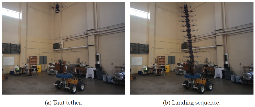 在这些实验中,TUAV从相对于平台的不同相对位置开始。实验是在高架设施中进行的。图8显示了实验设置的图像。图8a显示了啄木鸟悬停在UGV上方,系绳完全伸展并拉紧。在图8b 中,一系列叠加快照显示了无人机接近并降落在Rhino顶部的平台上。