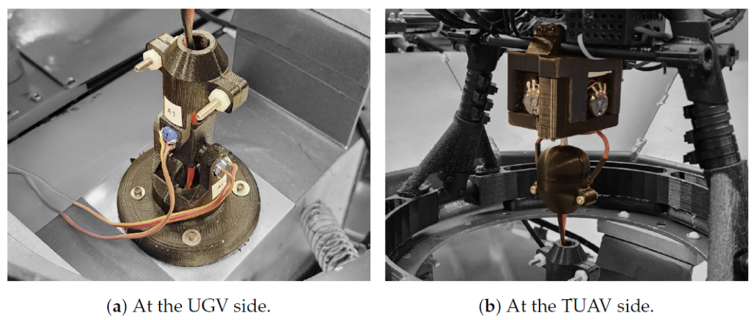 UGV中包括一个自调平平台,为无人机着陆提供稳定的水平表面。在我们的设计中,我们使用一个三轴加速度计和两个线性执行器来调整平台姿态并保持水平,即使UGV位于不平坦的地形或斜坡上,如图5a所示。该平台有助于确保无人机安全精确地着陆,而不会翻倒或损坏自身或其周围环境。