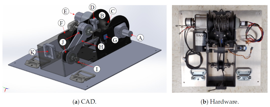 图4.电缆管理系统。(a)系统的三维CAD模型,突出显示滑环装置(A),该装置允许将电力从其外部固定框架传输到物理连接到存储电源线的定制3D打印线轴(B)的内部旋转框架。电缆进入线轴轴线,从(C)出来,穿过漏斗状装置 (D)。该设备由伺服电机驱动,伺服电机从一侧移动到另一侧,以将电缆均匀分布在线轴上。当直流电机(F)转动时,系线的长度由数字旋转编码器(E)测量。系线张力由安装在枢轴杆臂(H)轴上的电位计(G)测量,该杆臂支撑一对滑轮 (J),电缆可以在其中滑落。弹簧 (I)用于加载杠杆臂。电缆通过插座(K)进入系统。(b) 所设计系统的实际实施情况