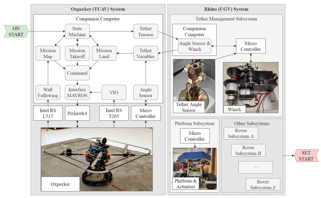 地下矿井等环境面临的主要挑战之一是无法获得GNSS。由于地下无线电范围有限,远程操作也是一个挑战。因此,必须具备强大的车载导航系统(包括定位、测绘和运动规划)才能使完全自主的系统可靠运行。这里介绍了最先进的系留无人机(TUAV)的开发,它是图 1 所示的完整自主机器人系统的一部分。该系统由名为Rhino的无人驾驶地面车辆(UGV)和称为Oxpecker的TUAV组成,旨在为地下石矿支柱结构完整性提供早期预警信号。