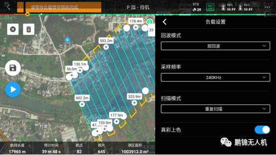 大疆M300RTK参数设置为航向重叠度80%,旁向重叠度70%,飞行高度115米,起飞速度15m/s,航线速度10m/s。L1雷达参数设置为重叠度50%,回波次数2回波,频率240KHZ。