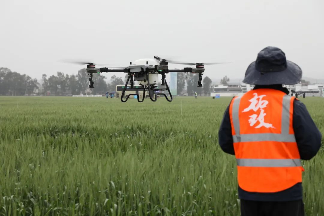 2023年3月23日,全国春季农业生产工作会议在四川省德阳市召开。中共中央政治局委员、国务院副总理刘国中出席会议。当日刘国中在德阳市广汉市国家现代农业产业园进行视察,现场拓攻机器人新品农用无人飞机进行演示。在这一块块平坦整齐的麦田上,拓攻六台丰鹏400飞跃而过,进行喷洒作业,展示了当下农业智能化过程中“种”、“管”环节的专业水平。