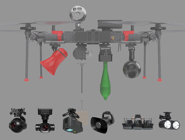 Krane 130的快速安装结构使得任务载荷的安装变得非常简单,可以轻松安装云台相机、激光雷达扫描仪、货物投递箱、货物释放和投放装置、扩音器、灯等多个任务载荷,以执行不同的任务。比如,可以同时安装上下安装的云台相机,实现上下视角的同时拍摄和记录;也可以搭载货物投递箱和激光雷达扫描仪,实现远程投递和精确扫描等任务。