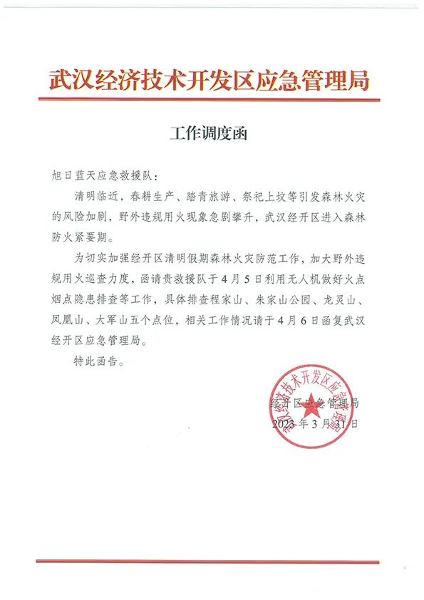 近日,随着清明节的临近,为切实加强清明假期森林火灾防范工作,加大野外违规用火巡查力度,应经开区应急管理局调度,旭日蓝天应急救援队于4月5日携带水星X4多旋翼无人机对经开区多处重点区域进行了高空防火宣传和巡查,根据隐患排查点位,规划巡护路线,制定飞行计划。
