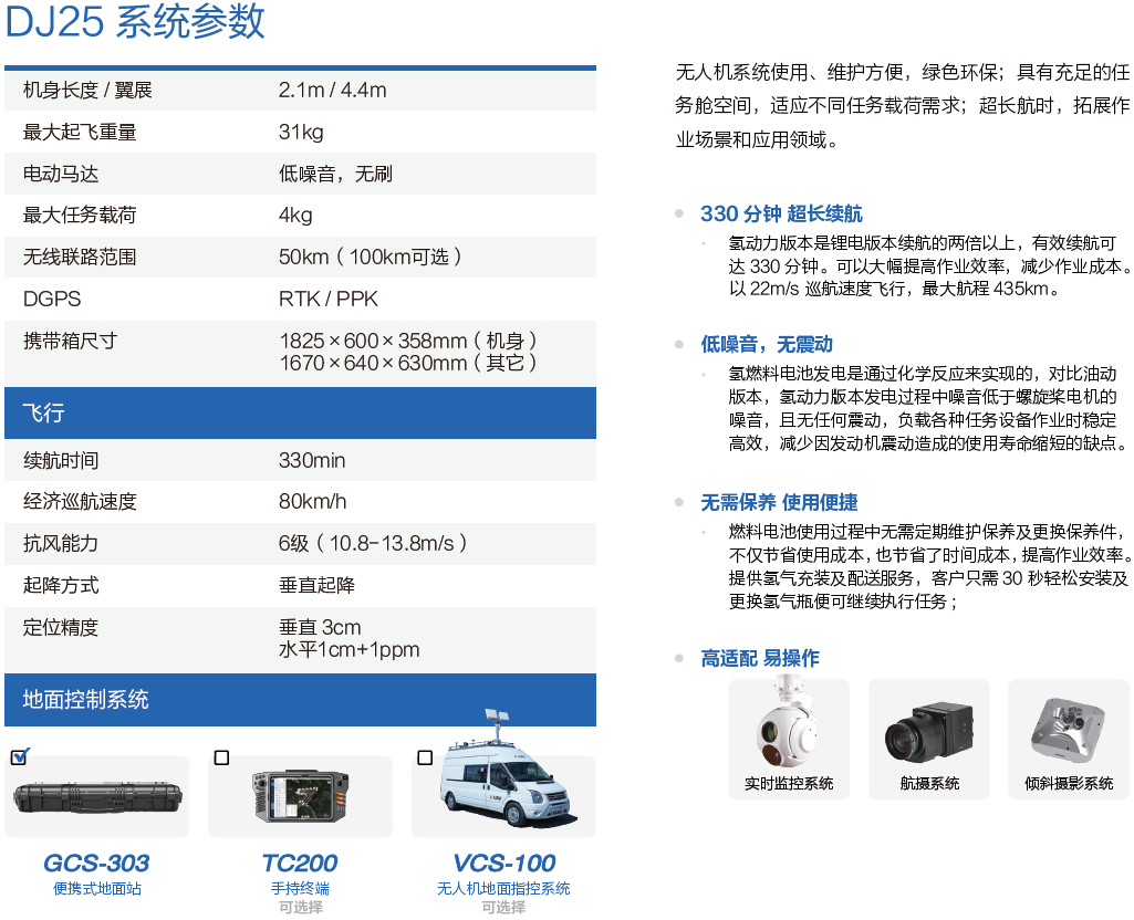 DJ25 (CW-25H) 是全球领先的实用型的氢动力垂直起降固定翼无人机系统, 有效负载下最大续航时间330 分钟。通过纵横股份无人机飞行平台与斗山创新燃料电池系统的深度融合,系统具备零排放、无噪音、低振动、低维护成本等优点。同时,其续航能力和飞行性能也得到大幅提升,进一步推动了工业无人机在各领域的应用效率。