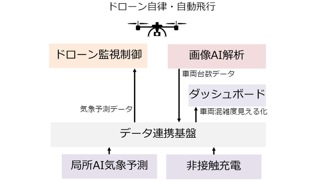在示范实验中,在一栋大楼的屋顶上建造了一个无人机的港口,自主和自动无人机在盘旋时从那里拍摄周围道路和场地上的停车位的航空图像,并通过对图像的AI分析来计算车辆的数量,以可视化拥堵的程度。还开发了一个工具,用于在航拍图像中指定要计算车辆数量的区域。