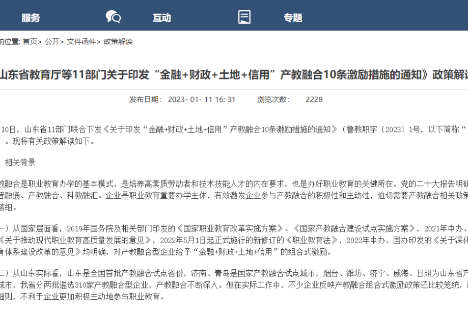 为贯彻落实《关于深化现代职业教育体系建设改革的意见》,2023年1月山东省印发通知,结合职业教育改革发展实际,细化“金融+财政+土地+信用”组合式产教融合激励政策,有效激发企业参与职业教育的积极性和主动性,充分发挥企业的重要办学主体作用。