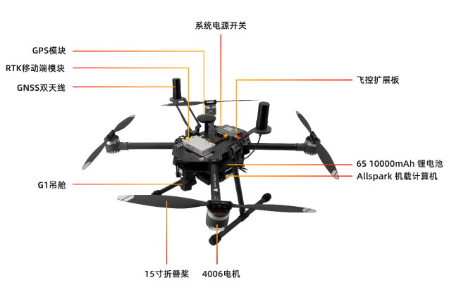 P600旗舰视觉款采用工业级、模块化的无人机平台,平台自重(含6S10000mAh电池,RTK定位模块、Allspark机载计算机及G1三轴吊舱)3.3kg,最大起飞重量4kg,最大有效载荷0.7kg,最大满载飞行时间可达28min。