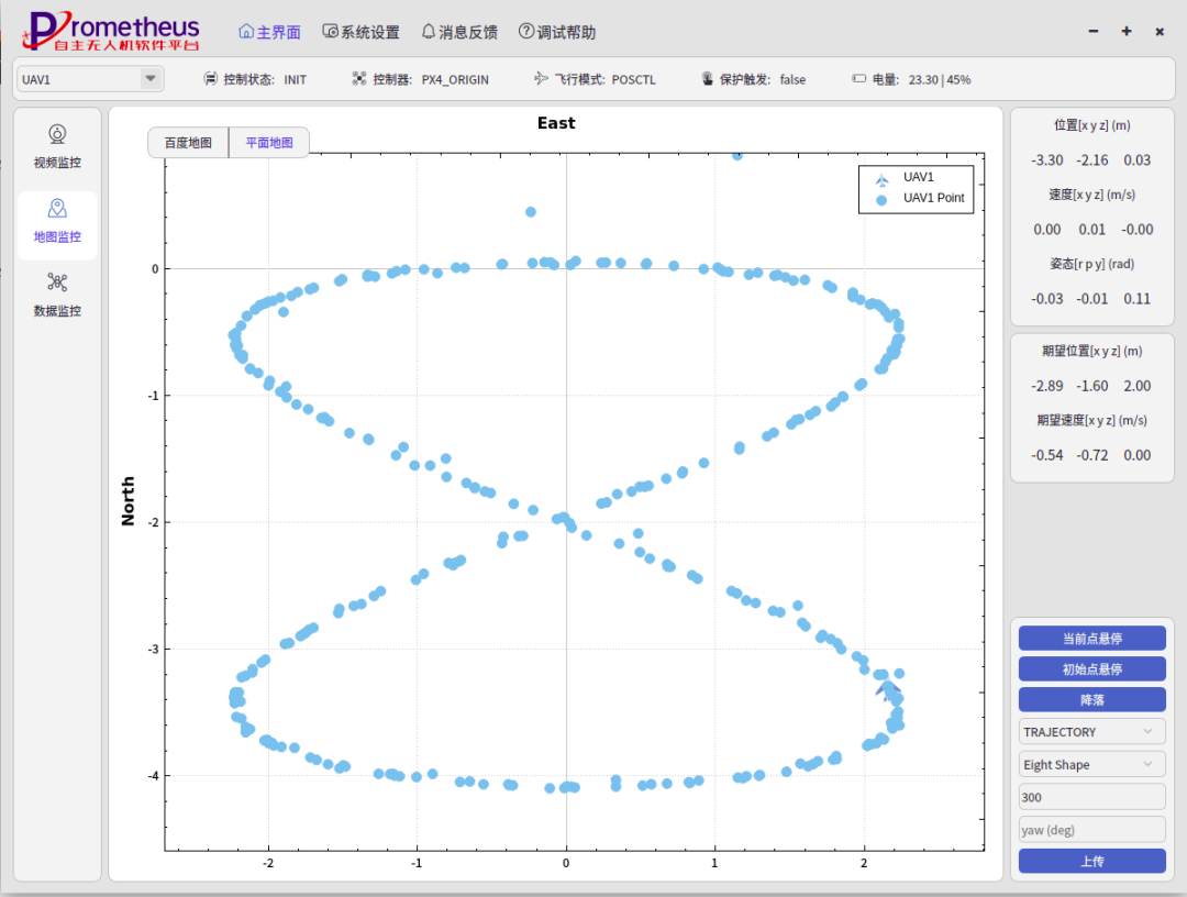 下图为Prometheus轨迹控制模式下的绕8模式,在该地面站上进行实时轨迹点打印输出显示。