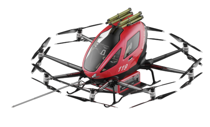 EH216F(消防版)是在EH216的基础上针对高层消防应急应用场景设计的全新版本,具有“超大载荷、快速响应、集群作业、远程操控”等特点,可灵活装载破窗一体灭火弹、灭火溶剂,针对高层火险,在确认着火点后,精准破窗、喷洒灭火溶剂进行覆盖灭火,有效控制火势蔓延。