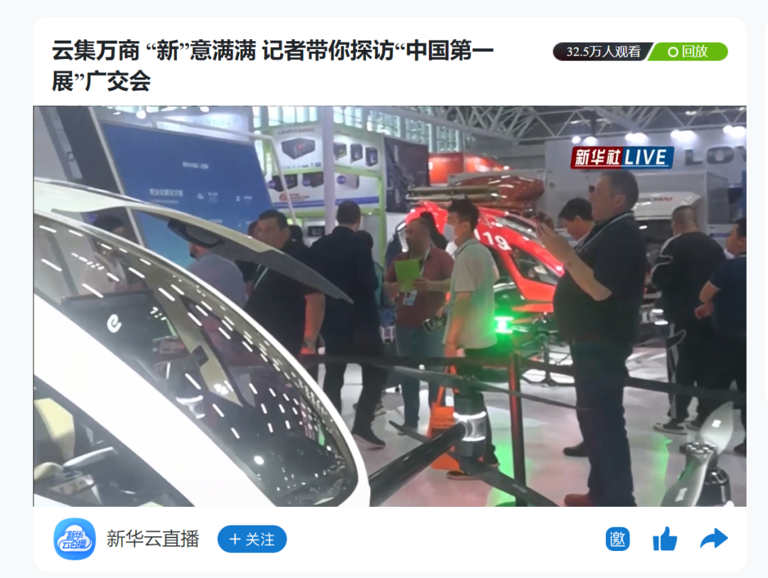 会展期间,中央广播电视总台央视新闻、央视财经、央视大湾区之声、总台CGTN、新华社、中新社、中国日报、广东电视台、大湾区卫视、南方都市报、界面新闻、21世纪经济报道、证券日报、广州日报、大公报及日本共同社等多家中外媒体通过视频直播、新闻报道全方位展示亿航智能先进城市空中交通的魅力和价值。