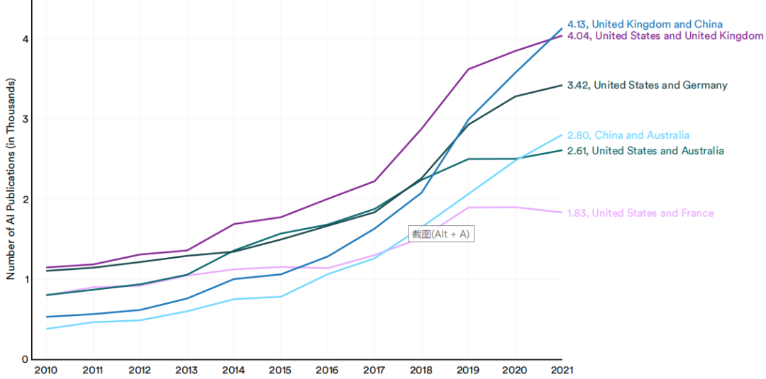 2010-21年人工智能出版物中的跨界合作(不包括美国和中国)