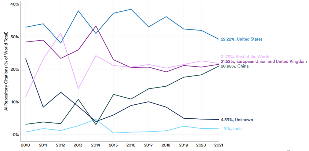 2010-21年按地理区域划分的人工智能存储库引用(占世界总数的百分比)