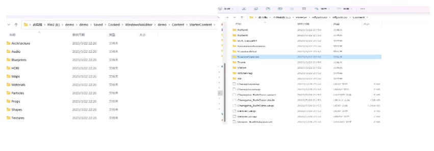 点击 菜单栏-“文件”-“烘焙Windows的内容”,等待烘焙完毕。去【工作目录】SavedCookedWindowsNoEditor 工程名】Content里面看到自己的场景文件,本例子是“StarterContent”文件夹, 将本场景文件夹拷贝到 RflySim3D 安装目录下的 “RflySim3DRflySim3DContent” 文件夹 。