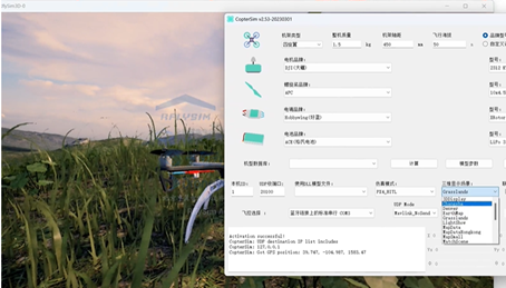 在Coptersim主界面的仿真功能区,选中三维显示场景,在仿真之前,可以设置在哪个地图下进行仿真。