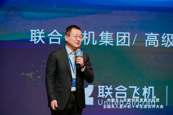 从技术创新到成果转化,从军用到民用,联合飞机用十年的时间,不断尝试,不断突破,打造了无人机产品、地面产品、无人机数字产品、配套产品四大业务方向,自主研发电控共轴操纵技术、高可靠多余度飞控技术、无人化改装技术、室内高精度自主飞行技术、重载荷吊挂稳定控制技术为代表的五大核心技术,形成了物资运投、农林植保、电力巡检、应急救援等行业解决方案。联合飞机集团高级副总裁赵巍先生为现场嘉宾分享了联合飞机和无人直升机行业共同成长的十年成果,并表示,下一个十年,联合飞机将与行业携手共进,创新应用,助推低空经济产业高飞。