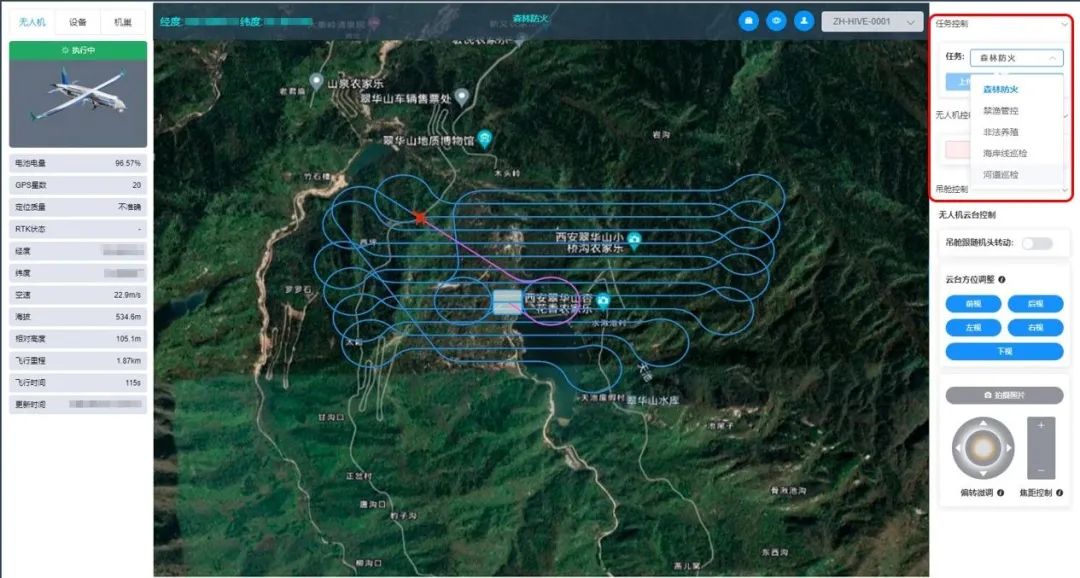 只需通过管控平台进行任务设置、航线规划,即可遥控自动机场上盖开合、无人机起降,无人机利用红外和可见光吊舱等任务载荷进行检测并实时回传视频画面,自动识别异常目标,实时报警并提供地理坐标,为指挥决策提供数据支撑。