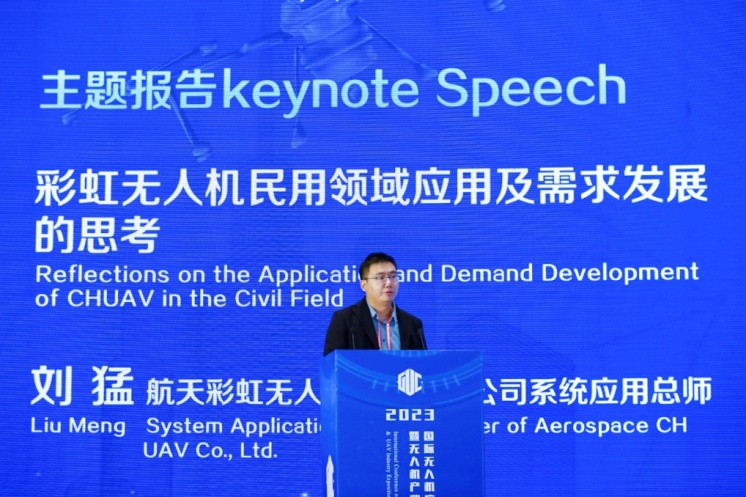 航天彩虹无人机股份有限公司应用系统总师刘猛作报告《彩虹无人机民用领域应用及需求发展的思考》。刘总提出,航天彩虹作为无人机系统集成总体单位,将始终坚持“军民结合、寓军于民”的方针,在融合创新中实践应用化、产业化、智能化,共同探索民用领域发展新模式,为民用航空强国宏伟蓝图贡献行业力量。