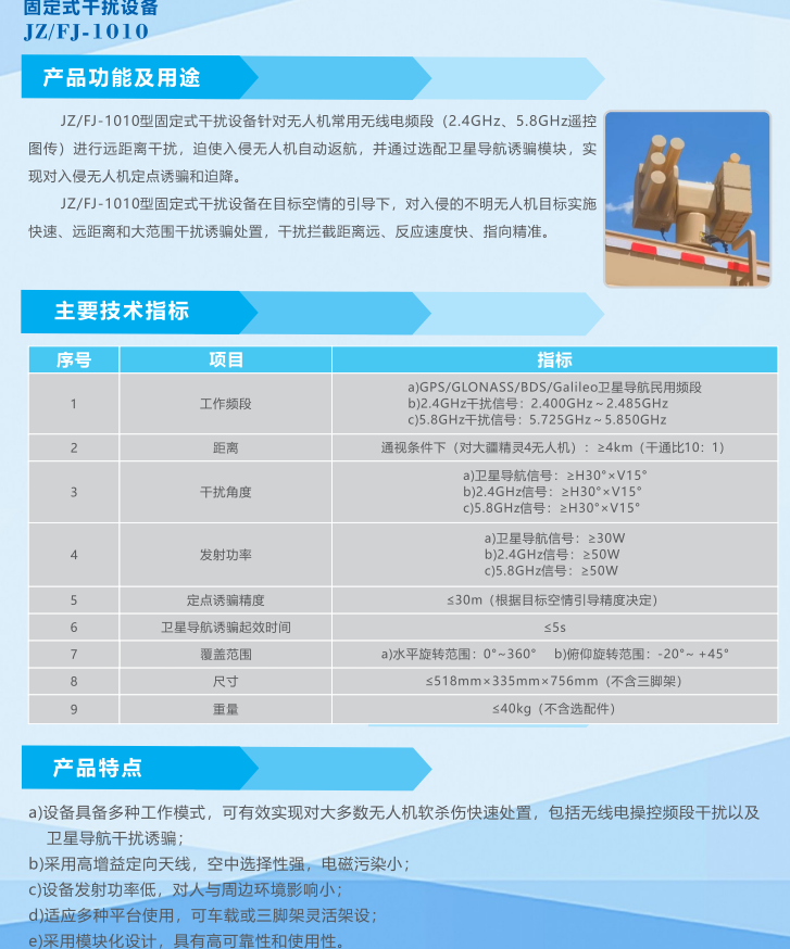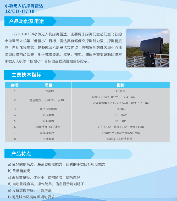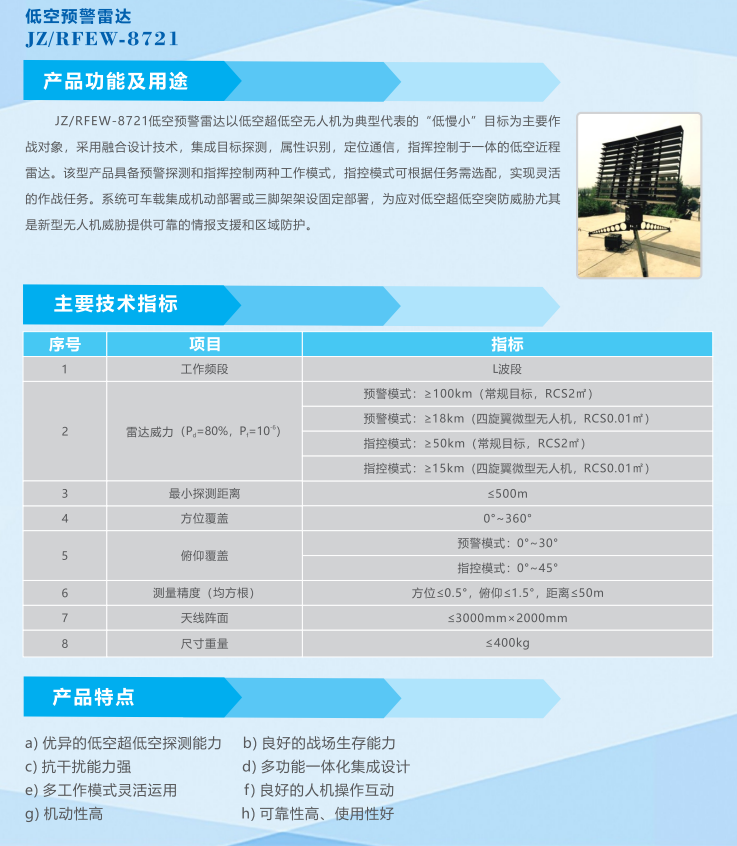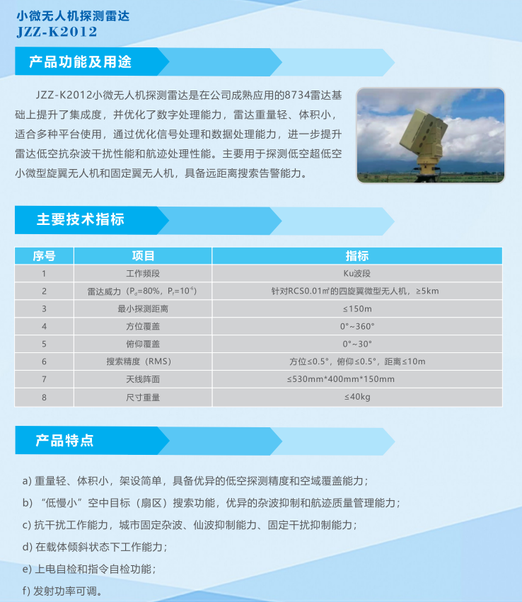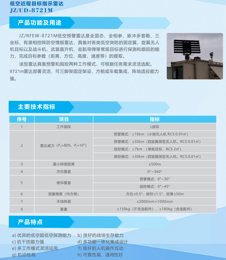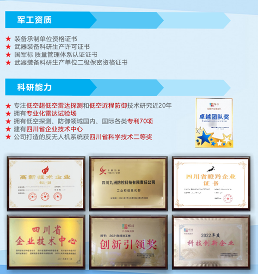 九洲防控技术力量聚焦低空、超低空目标探测和低空近程防御两个方向,主要经营范围为无人机防控系统、近程防御系统、低空探测雷达以及相关联的公共安全等系统和产品的研发、制造、销售和服务,是我军低空近程雷达和低空近程防御系统的骨干装备供应商,是陆军、空军多个型号装备的总师单位,已列装上百套雷达、低空近程武器指挥系统及反无人机系统;积极参加军方等单位组织的比测和演习,取得了良好成绩,并承担二十大、建党百年、冬奥会、十九大、两会等国家级低空防御专项保障任务,首长评价“系统在重大活动中发挥了重要作用”;在军贸方向,已获得国家反无人机系统、多型雷达系统军贸出口许可和军贸科研支持,产品出口中东、中亚、西非、南美等地区国家实战应用;同时,九洲防控积极响应国家军民融合大战略,利用军品研发积累的多项关键技术,开发了系列化民用低空探测、防御产品,应用于人防低空预警和反小微无人机安保等领域。
