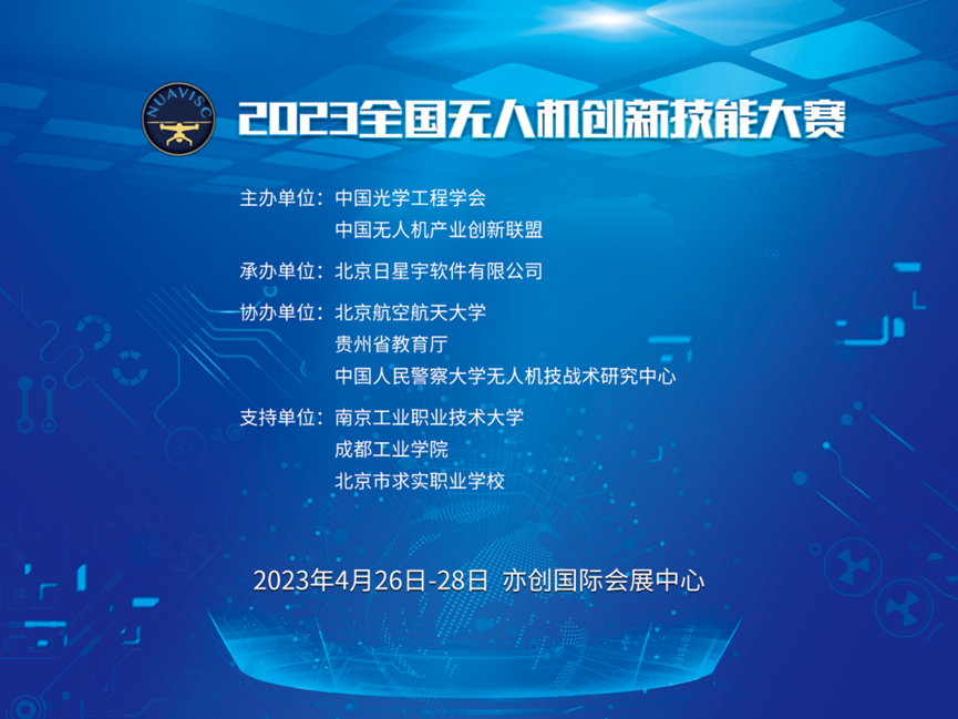 2023全国无人机创新技能大赛4月26日在北京亦创国际会展中心正式开幕,本次大赛由中国光学工程学会、中国无人机产业创新联盟主办,北京日星宇软件有限公司承办,北京航空航天大学、贵州省教育厅、中国人民警察大学无人机技战术研究中心协办。