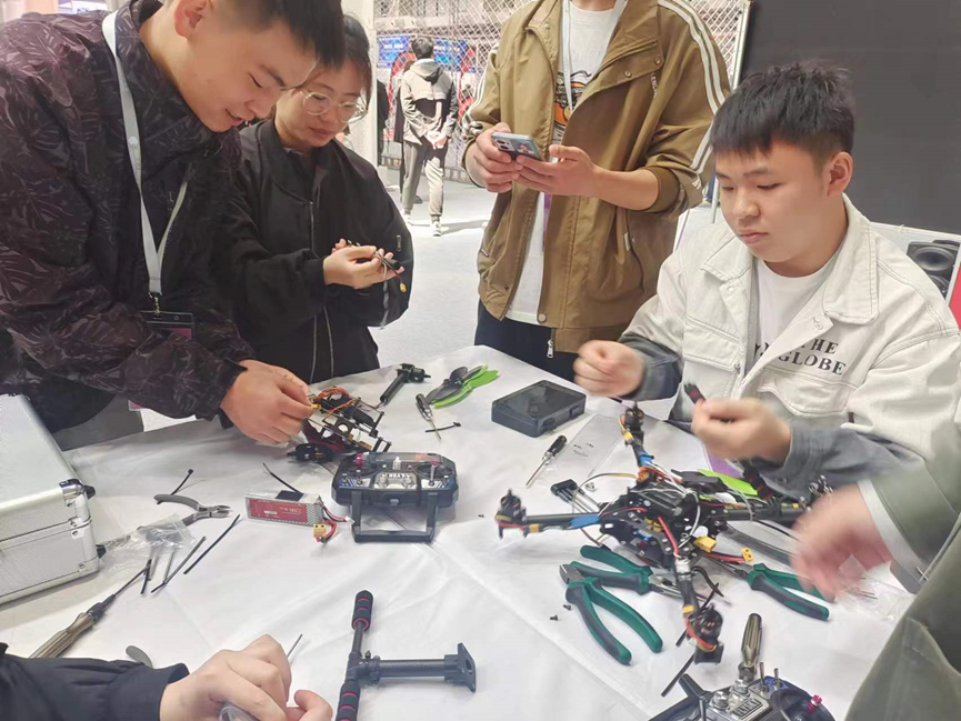 比赛检录完,正式开始各个赛项的比赛。应用技能赛项理论考试通过手机登录考试系统,完成理论考试答卷提交,自动阅卷生成考试成绩。组装调试环节由每个参赛队伍按要求完成无人机的组装,对机架装配、动力系统装配、遥控器调试、配件故障排查、试飞情况进行逐个验证,最后确定组装调试环节成绩。