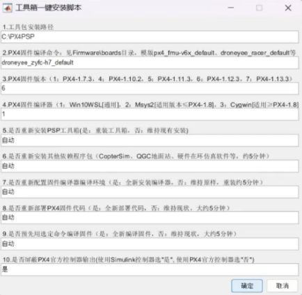 首先需要保证RflySim工具箱配置为自动代 码生成的形式。屏蔽PX4官方输出选“是”,因为我们要用Simulink控制器的输出来控制电机,需要 屏蔽PX4控制器的输出,以免冲突。