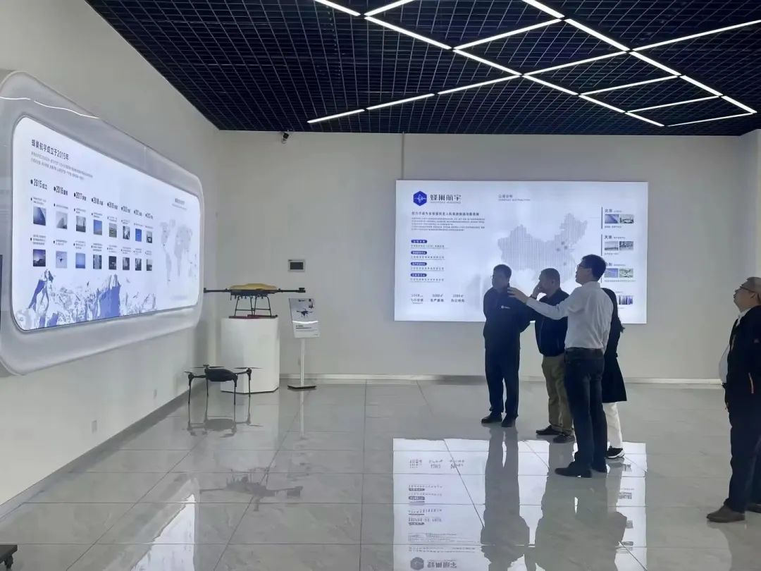 中国信息协会通航分会、成都无人机协会、成都航维智芯、天域航空、天津保税区管委会等领导一行实地参观了蜂巢航宇无人机展厅、设备研发、生产车间等场所,并详细了解基于无人机+全系列挂载+智能机库+软件平台的“无人值守”巡检模式的亮点功能和作业优势。