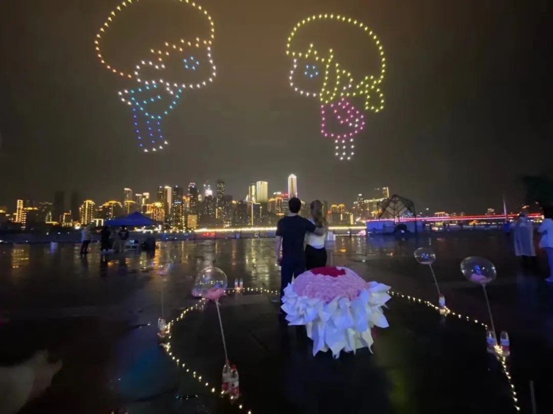 在魔幻城市重庆南滨路夜空,数百架无人机上演让“女生无法拒绝”的无人机求婚,当女主重庆方言说出“我愿意”的时候,在场观众和千机工作人员发出阵阵惊呼;互联网上也令无数网友艳羡不已。