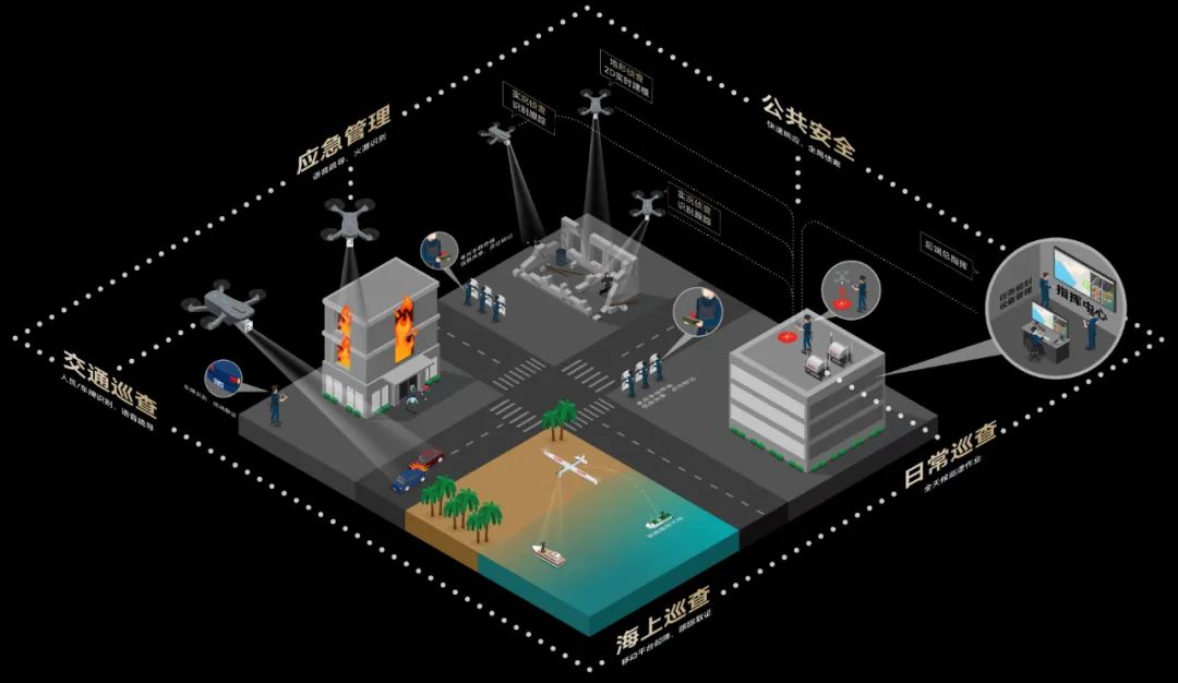 生活秩序恢复,娱乐、体育等大型线下活动正在逐步复苏。过去,安防工作往往存在人员聚集严重导致的危险因素隐蔽性强、巡逻效率不佳导致盲区难消除、场景复杂导致信息同步不及时等诸多痛点。面对公安机关迫切需要更多更好更先进、适应实战的警用装备来赋能公安工作这一需求,对此道通智能推出了空地一体数字化警务解决方案,以EVO Max 系列等无人机为首作为飞行平台,以Autel 智能遥控器 V3、单兵移动终端作为移动设备,以道通多旋翼机巢作为远程部署平台,以道通指挥中心及Autel Mapper作为软件采集层,以Autel SkyLink图传、A-Mesh组网等作为数据传输层,带来涵盖空域、陆地、前方行动队、后方指挥部综合一体的作战管理系统。