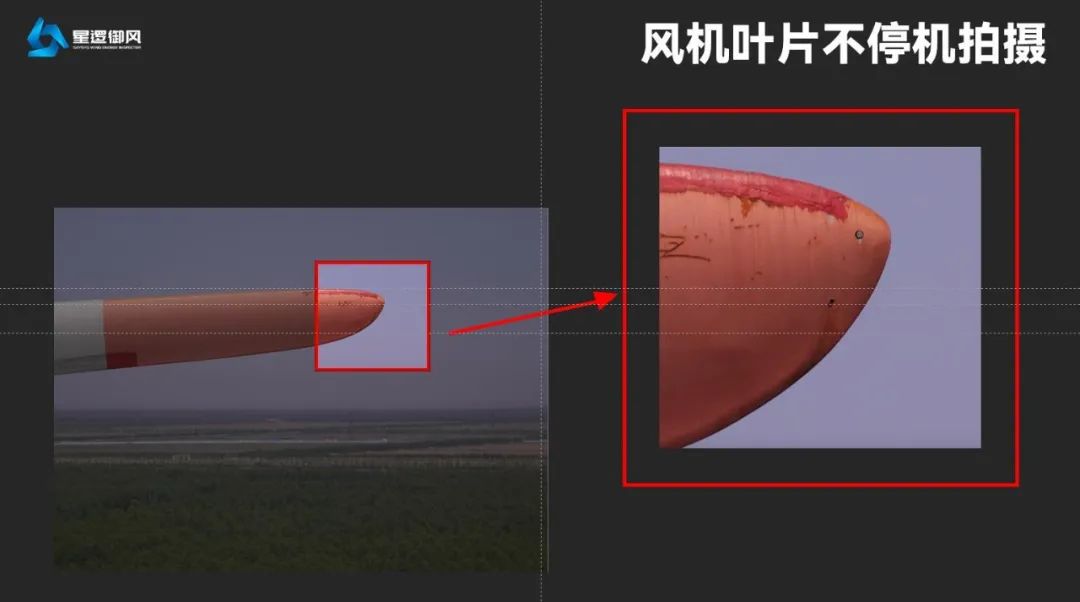 巡检过程中,无人机在星逻御风的加持下,依托人工智能深度学习识别算法,辅助雷达测距技术和智能航线规划技术对风机进行拍摄。无人机可在风机旋转直径虚拟球外40-60米完成自动拍摄,借助高速云台相机对60米以下的风机仅拍摄1-2张照片即可满足单个叶片拍摄要求,克服了以往变焦镜头拍摄同样叶片需要40多张照片带来的照片拼接复杂,效果不能保证的难题。