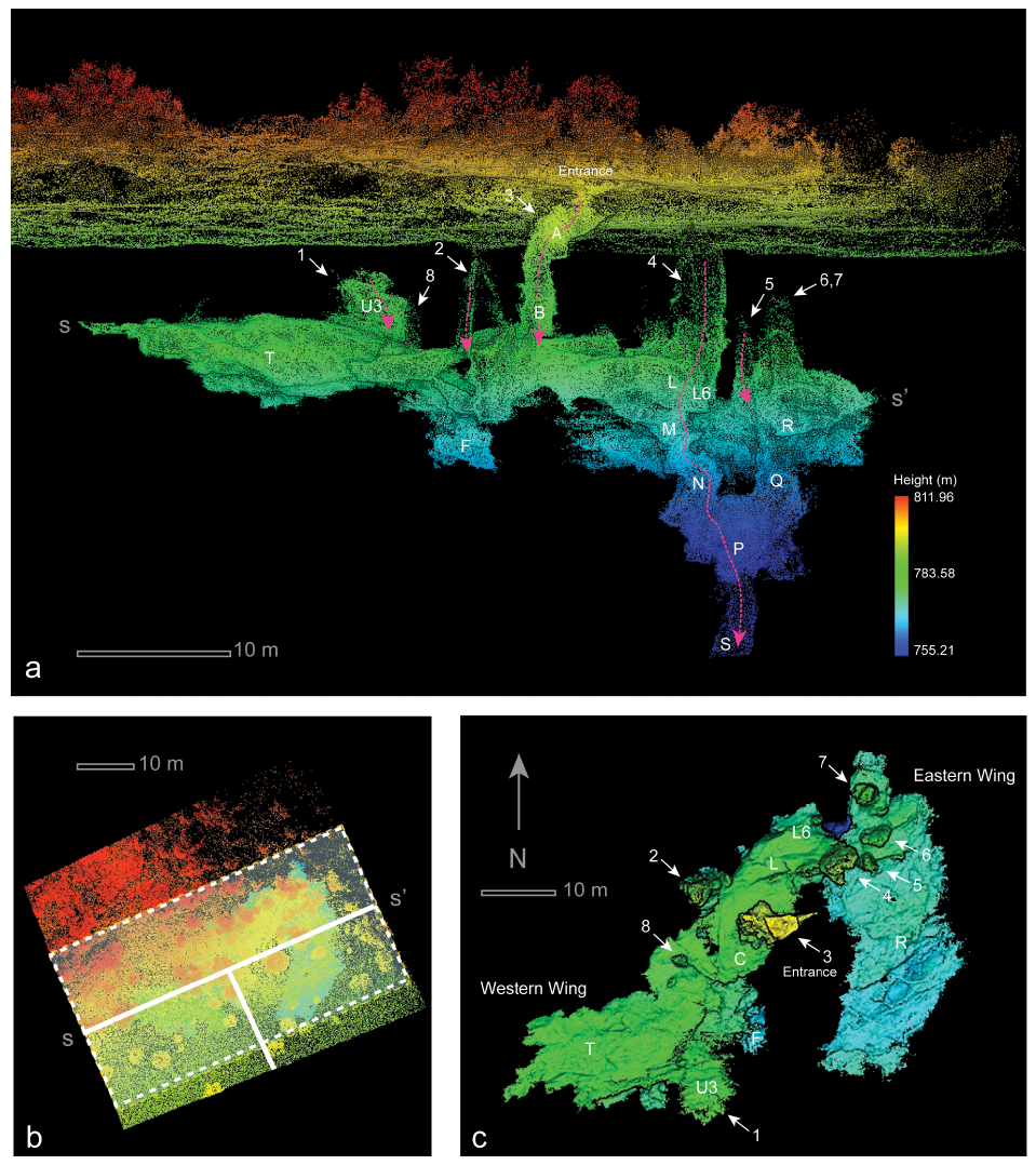 洞穴的整个空间可以分为两个“翼”(以下简称东翼和西翼),在入口竖井的底部分支。每个侧翼由房间、画廊和通道组成,这些通道排列在多个楼层中,由垂直或倾斜的空隙连接(图3a)。这些空间的轮廓通常由巨石和沉积物描绘,而基岩露头仅在地下系统的边缘。这种洞穴结构是黎凡特地中海高地地区老化室洞穴的典型特征,包括史前时代晚期使用的洞穴,例如西约旦中部高地的Nahal Qanah和'Abud(图3b-c)。洞穴沉积在不断滴落的区域,沉积物通过洞穴系统上部的裂缝和小空隙从地表渗入(图2c)。