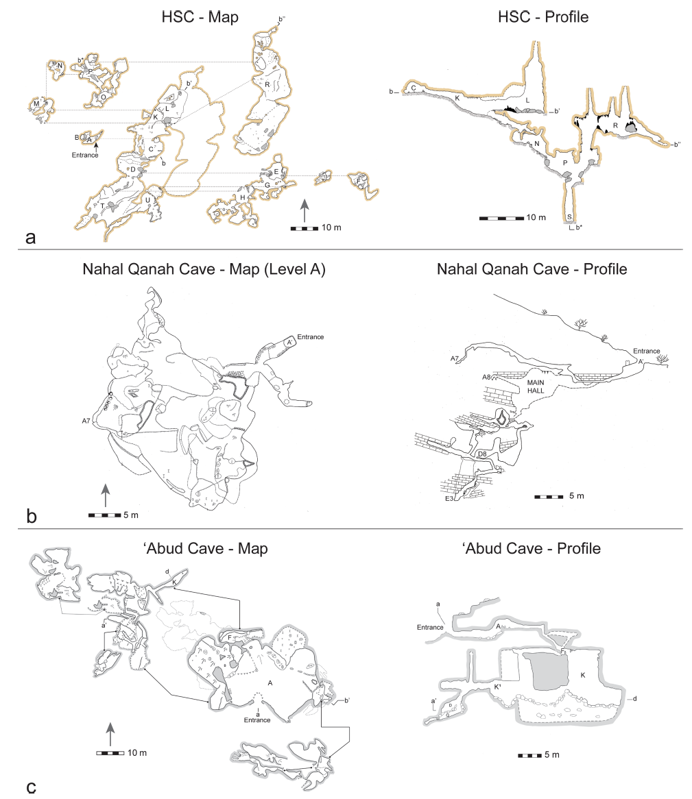 图3 文中提到的三个老化室洞穴(HSC、Abud和Nahal Qanah)的平面图(左)和剖面图(右)。三处遗址都有丰富的考古发现,可追溯到黎凡特史前晚期。a.红十字国际委员会于2016年绘制的HSC; b.Nahal Qanah洞穴,1981年至1991年间由红十字委员会绘制; c.阿布德洞穴,红十字国际委员会于2009年绘制.