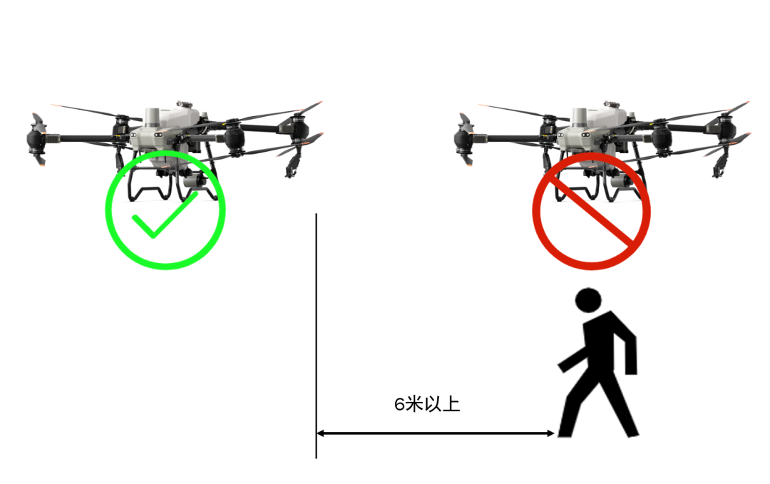 在飞行时,时刻与人保持6米以上安全距离,不可在人员上方飞行。如有人接近正在飞行中的农业无人机,则必须主动避让。如发现农业无人机飞行姿态不稳定,则应迅速清空周围人员,快速降落。