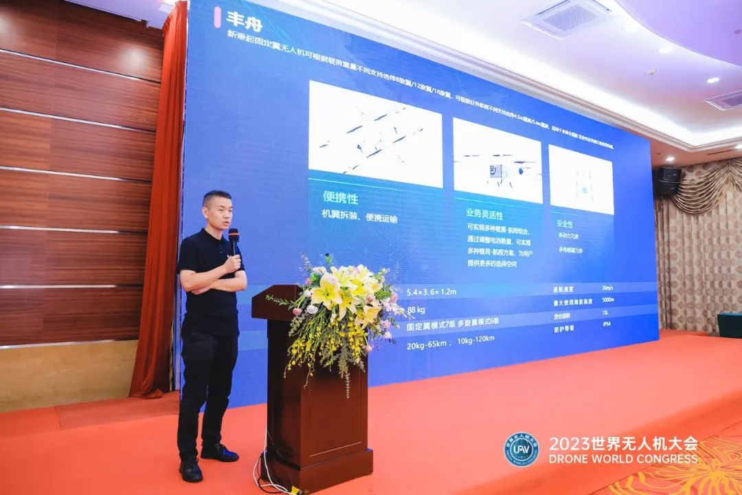 ▲世界无人机联合会葡萄牙分会会长莱里奥·迪尼斯·费雷拉·莱特先生致辞在论坛上,丰翼科技带来了一场精彩纷呈的新品发布会。丰翼科技是顺丰旗下专注于末端配送物流无人机研发和运营的企业,目前已实现全商业链路闭环。作为具备独立研发、测试、生产和运营等能力的综合型企业,丰翼科技一直致力于将物流带入无人机时代。已完成物流无人机常态化、大规模安全运行相关体系建设,拥有完全自主知识产权,申报专利近400项。本次发布会带来了2023年最新产品:丰舟90和方舟150无人机。其中,丰舟90无人机可根据不同应用场景灵活组合,通过调整电池数量,实现20kg-65km、10kg-120km多种载荷-航程配置方案,为客户提供更多选择;方舟150无人机拥有强大的运载能力和优异均衡的综合性能,用户友好的易操作性等特点。