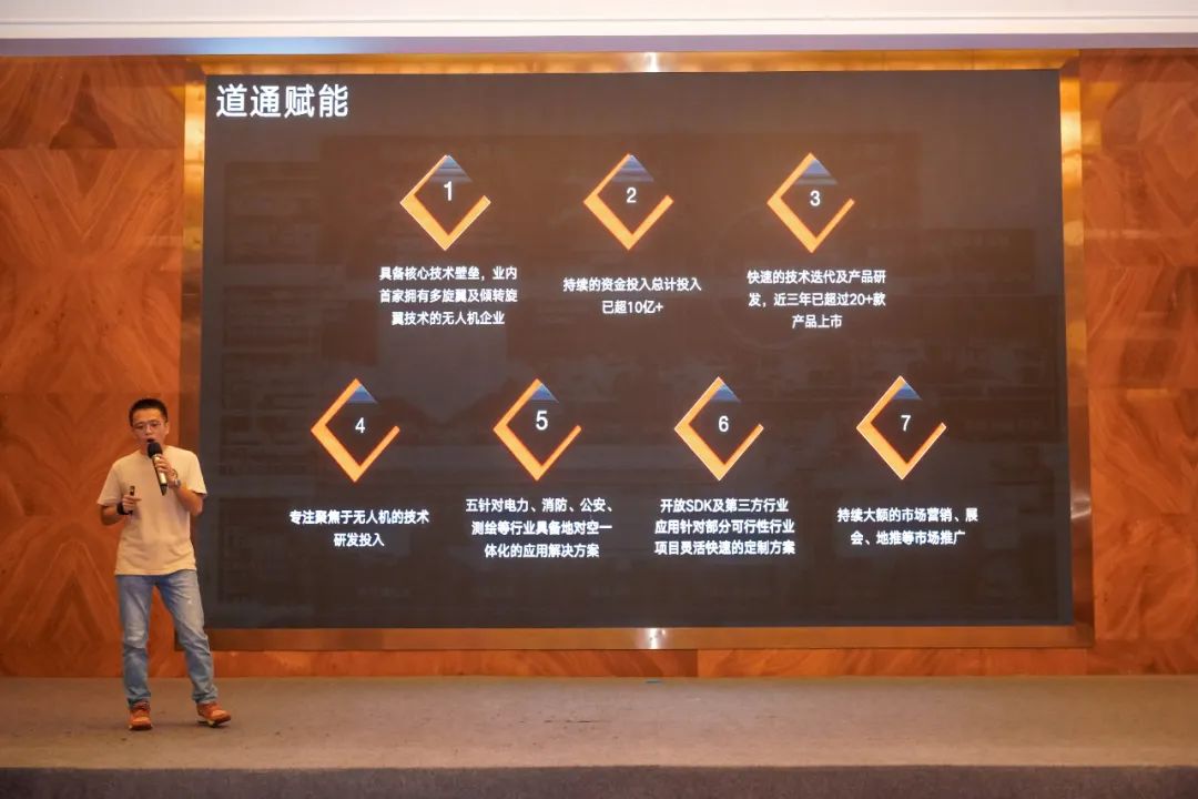 道通智能行业新品推介会 · 深圳站回顾视频在会议现场,道通智能全球市场总监刘国正介绍道,道通智能伴随无人机行业发展正不断成长壮大,始终坚持核心技术的积累与突破。道通智能拥有多款无人机飞行平台,以满足行业客户对于性能、飞行、影像、安全等方面差异化的要求。正如飞赢科技等战略合作伙伴的踏实付出和信任,给予了道通智能在前进道路上的强劲动力,感谢一路陪伴并表达了未来合作共赢的美好祝愿。