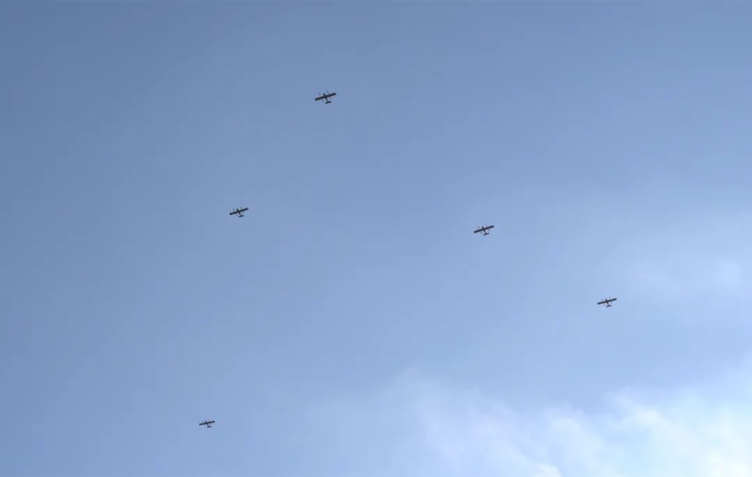 沙龙的最后环节,雷迅创新在飞行基地为客户进行了LBA 3无人机编队飞行的演示。通过LBA 3大带宽,可组网的特点,搭配雷迅创新二次开发的LGC地面站,在现场为客户进行了5机编队的飞行演示,五台Raefly VT260依次起飞,随后组成“V”字阵型,从飞行基地上空整齐的掠过,形成了一道非常亮丽的风景线。