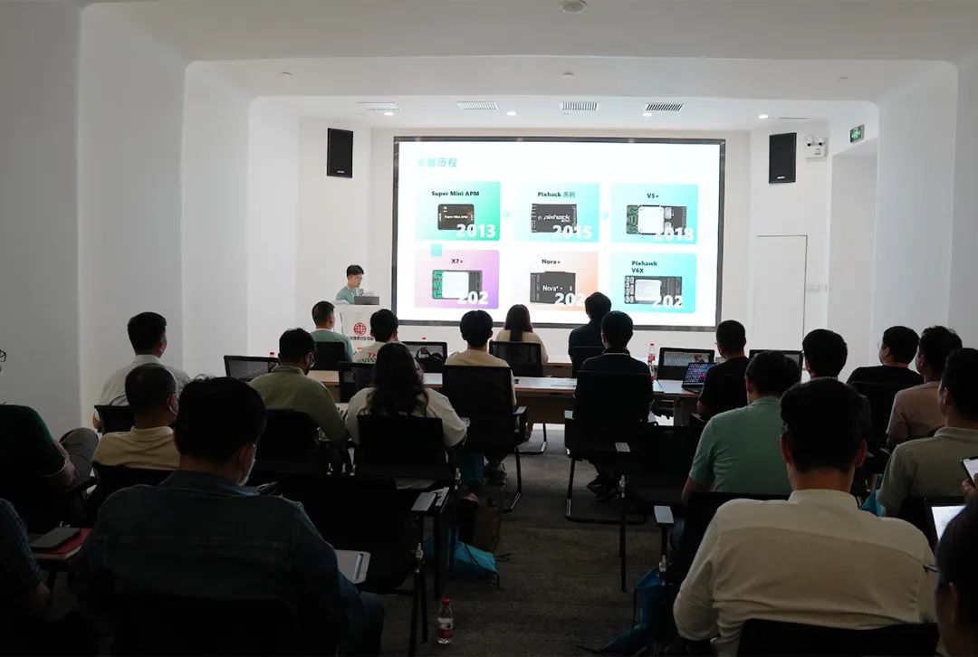 沙龙的开始,活动主持人为大家介绍了公司的历史,从早期的Super mini APM飞控,直到现在最新的Pixhawk V6X飞控,雷迅创新从未止步,同时业务也围绕无人机核心领域扩展,覆盖飞控,基站,GPS/RTK,雷迅云系统,无人机整机与无人机技术服务等,形成了完整的无人机解决方案。
