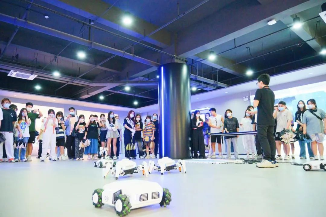 研学团参观了基地二层的主要功能区,包括擂台竞技区、地空竞技体验区、无人机编队全球数据中心、高巨创新低空无人机监测验证中心、无人机复材透明工厂以及产学研联合实验室。