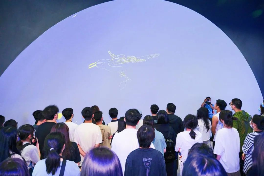 随后,研学团的同学和老师们参观了飞跃世界球幕展示区,并在这里观赏了高巨创新以往的无人机编队表演视频,沉浸式地体验了无人机表演的现场氛围。