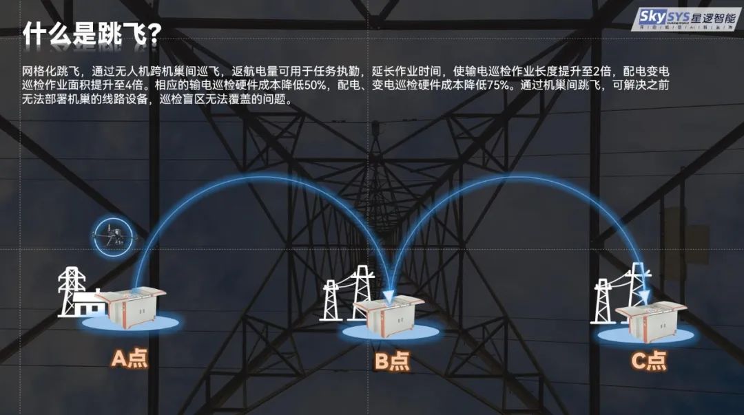 无人机跳棋式作业是星逻巡电的优势功能,有效适配电网长线巡检的要求,实现目标场景的全域覆盖。为延长无人机的巡检范围,用户可在沿线设置机库站点来支撑无人机在长距离或大范围场景中的接续飞行。