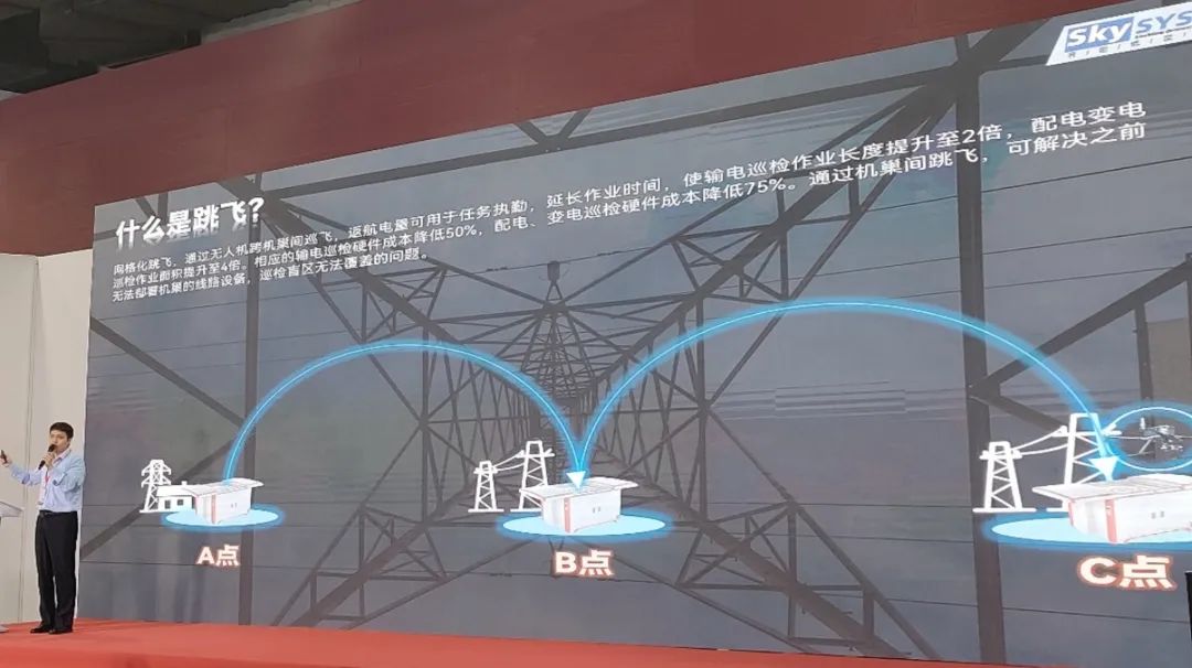 当无人机电量告急时只需降落在就近机库上即可实现自动充换电,“补给”结束后再次起飞完成剩余任务,成倍提升了电网巡检的效率,降低了人力资源成本。