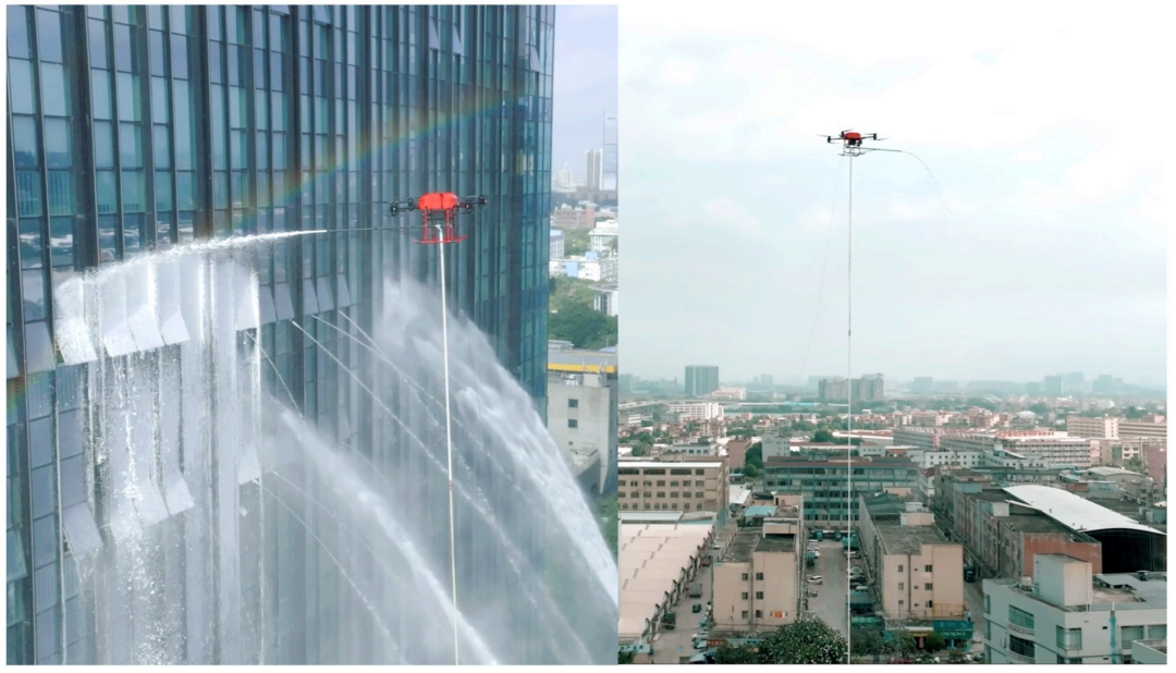 无人机上电后1分钟内就可以起飞,带上水带,30秒可爬升到170米作业高度,每分钟可喷洒1.6立方米泡沫灭火剂,从作业高度、爬升速度、作业效率、安全性上都超过传统云梯车。